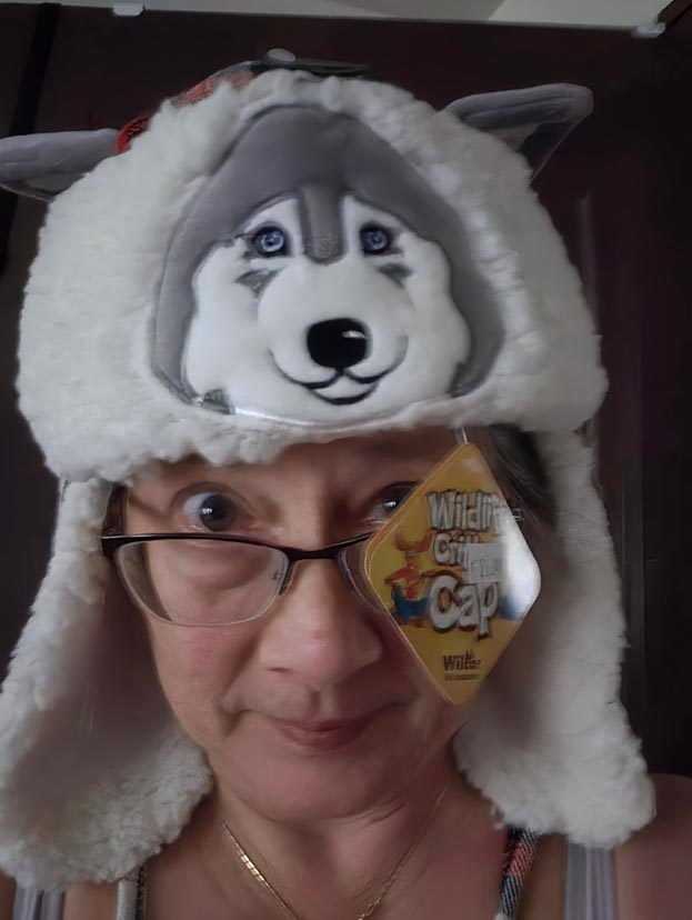 The hat is made of red and grey plaid with a husky face and ears. Fits size 7 adult head.