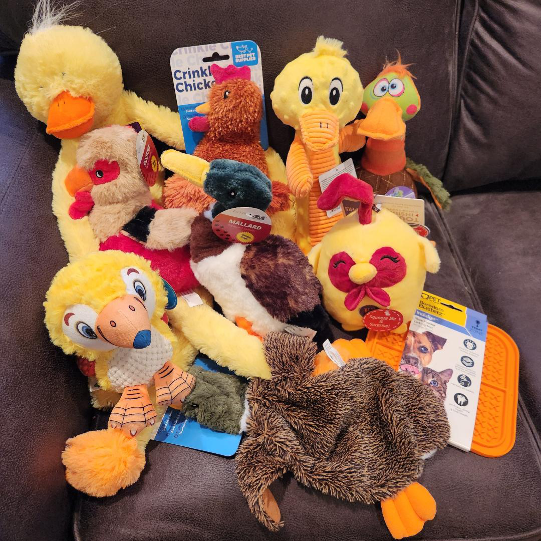 This package includes 9 ducks and chickens that squeak, crinkle and grunt, plus a licky mat.