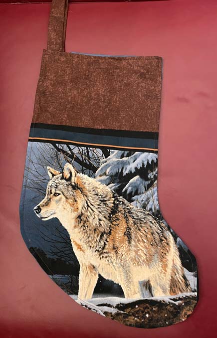 This wolf-themed Christmas stocking measures 12" x 18". Hand made by Marie Stevens.