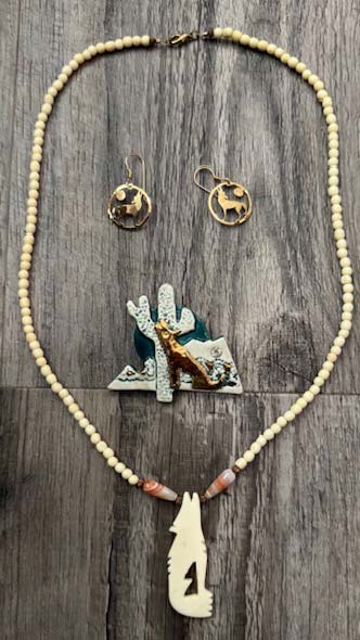 A lovely beaded necklace with an artistic wolf, a cute howling pin and a pair of gold-tone earrings. Wear together or separately!