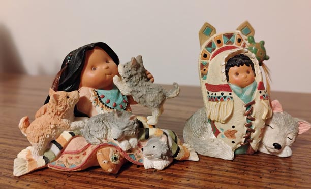 - "She who Laughs with Friends", 1999. Eskimo girl with 4 adorable puppies. Measures 3¼" x 2" x 2" high.
