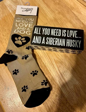 And, a pair of socks stating "All you need is love and a dog. Please note the small chip in the box sign.
