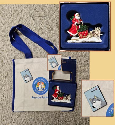 Santa ornament: Santa on a sled with a large red package being hauled by two happy huskies. Ornament is 3½" high, 4¼" long. Includes thick rubber 2" x 3" husky head magnet and a 2023 rescue parade tote bag measuring 12" x 14".