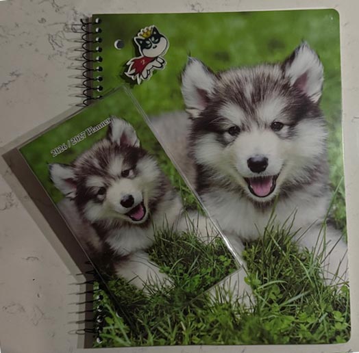 Cute spiral notebook and 2 year planner adorned with a very cute Husky puppy. Bonus Husky pin!