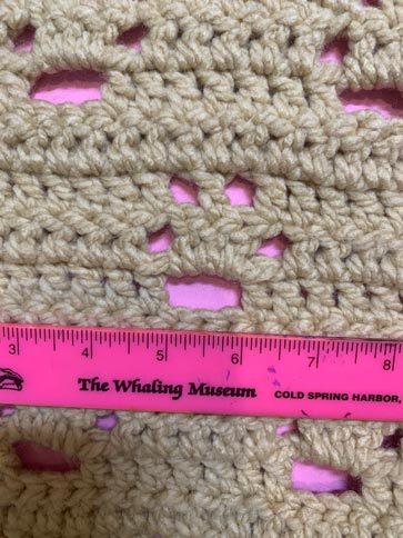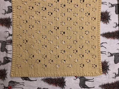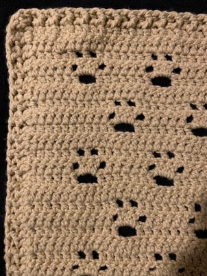 close upThis crocheted lap blanket features see-through doggie footprints. The blanket is approximately 38' x 38", made of acrylic yarn, machine wash and dry (gentle cycle).