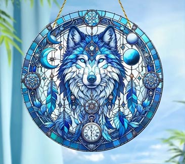 This suncatcher is 8" in diameter and is made of acylic for indoor or outdoor use.