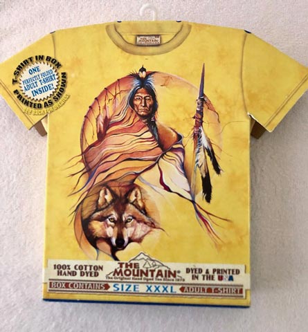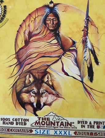 Made of 100% hand dyed cotton, this unisex tee portrays spirit friends, Indian and Wolf.