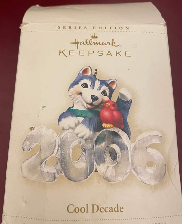 Cool Decade is the theme for the 2006 Hallmark Christmas ornament and has a cute husky. The ornament is about 2 inches by 2 inches.