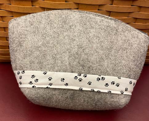 This is a fun small bag to hold what you need it to hold. It is felted wool with a trim of paws. It is 8½" x 4" x 2".