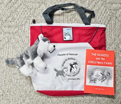 The charming book by H.M. Young, Huskies and the Christmas Fawn. Autographed with illustrations by Barbara Branham. 32 pp, published by Adopt a Husky Inc, 2007, with forward by Lois Leonard. Measures 6" x 9". Package also includes a Stuffie 11" nose to tail and 7" high, a rubber husky head magnet (2" x 3") and a 2019 SHCA Rescue Parade Bag, 14" x 14" with front pocket.