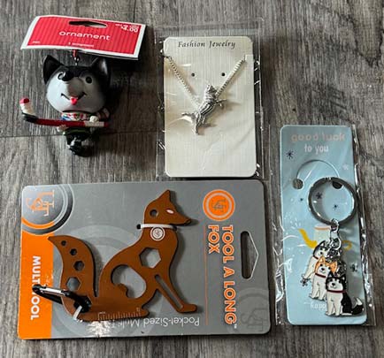 This cute assortment of gifts is perfect for a Husky or Wolf lover. It includes a Husky Key Chain, Silver-toned Husky necklace, a Husky playing Hockey ornament, and a "Tool a Long Fox" Multi-tool.