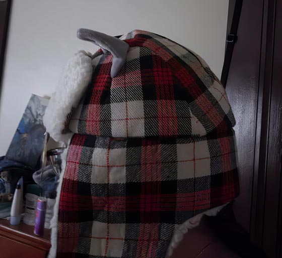 plaidThe hat is made of red and grey plaid with a husky face and ears. Fits size 7 adult head.