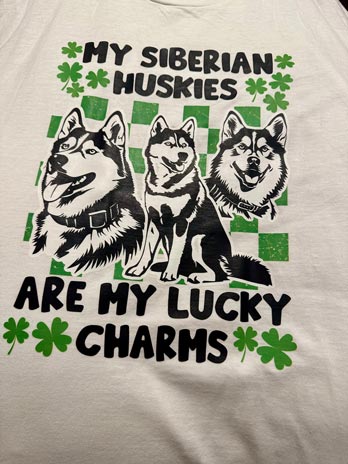 detailCustom made (by a friend of Amy's) XXXL, long-sleeve, white "Siberian Huskies Are My Lucky Charms" Tultex T-shirt with paw prints down the right sleeve. Super cute! Perfect for St Pat's Day!