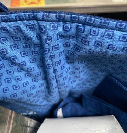 detailThis is a 11" x 13" x 4" padded shopping bag made with a Van Zyle panel of a husky on a box. The inside has a pocket divided into 3 sections. Hand made by Marie Stevens.