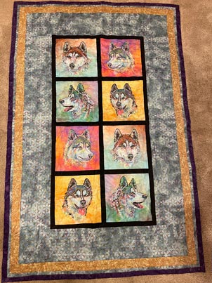 This quilt features 8 different Van Zyle Siberian Husky heads. The quilt is 40 x 60 inches and is all machine sewn. It has a lightweight batting.