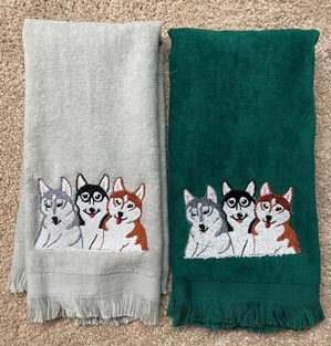 This is the resurrection of an image we used on polo shirts many years ago. But now you can choose the puppy colors. For the auction, we are offering two hand towels in a choice of white or green. You can select from the towels already embroidered, or choose your own puppy colors. A white dog will not show well on the cream/gray towel.