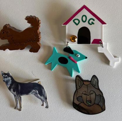 I call this the dog house set as the largest pin is a dog house with an attached dog and bone. Then, there is a brown dog that might go with that. Also, a standing grey and white husky and a husky head.