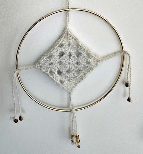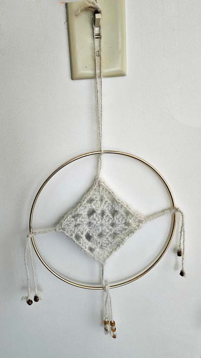 detailDreamcatcher for your window or wall. This was crocheted by Celine Tews from yarn spun by Cheryl Dawson from her Cocoa's fur. It measures 9" in diameter. Tail is about 3" long and hanging loop is about 6½" long. Beads are made from wood and clear plastic.
