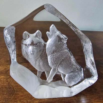 Crystal sculpture from the Mats Jonasson Studio in Sweden features a pair of wolves, one of which is howling. Stands 5" high and about 5½" wide.