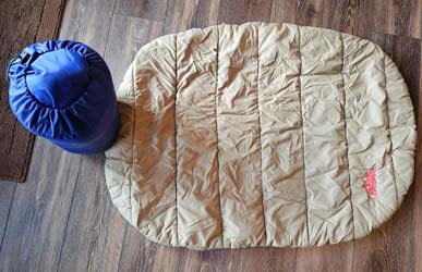 Crushable sleeping mat from "Canine Hardware". Gently used. Blue and tan; can be stuffed into provided bag for transport. Fluffs up nicely when removed. Measures about 29" x 39" x 1½" high when shook and fluffed. Two available. If winning bidder does not take both, the other will be offered to the second highest bidder at the winning bid.