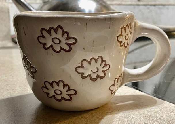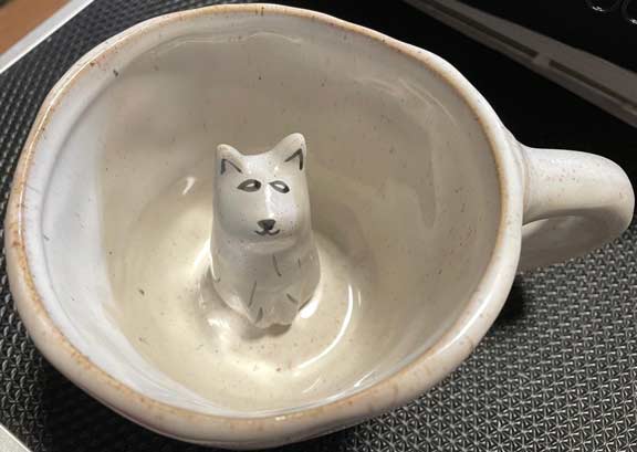 Adorable ceramic cup with a white dog, maybe a Sibe inside, flowers on the outside. Cup has a handmade look, but is made in China, dishwasher and microwave safe. Probably never been used. The cup is about 4" in diameter, 3¼" tall and about 6" wide with handle. It weighs about 13.4 ounces.