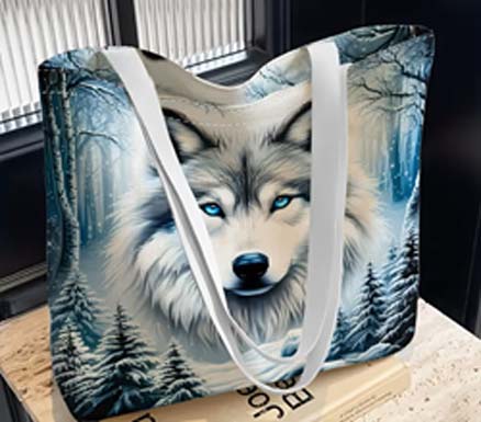 This tote bag has a beautiful picture of a husky printed on both sides. It measures 13.77" x 15.79". This is a super nice item. If you can use a tote bag for shopping, carrying extra books or a quick grocery stop - don't let this one get away!