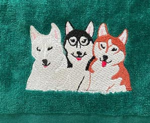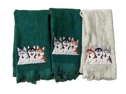 This is the resurrection of an image we used on polo shirts many years ago. But now you can choose the puppy colors. For the auction, we are offering two hand towels in a choice of white or green. You can select from the towels already embroidered, or choose your own puppy colors. A white dog will not show well on the cream/gray towel.