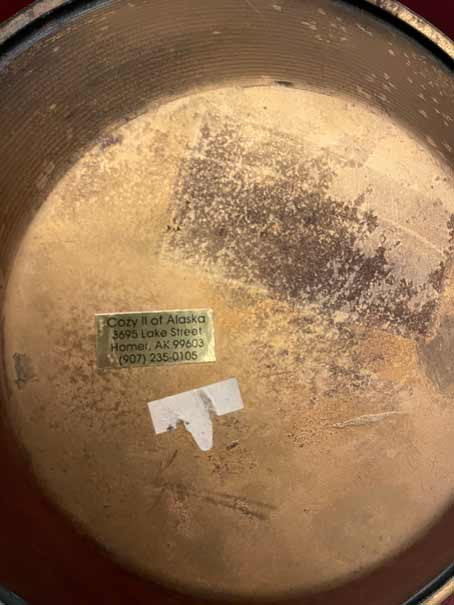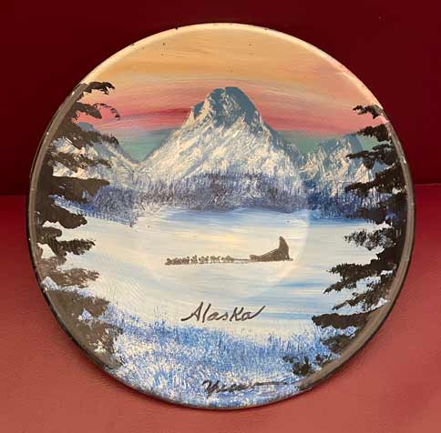 This is a gold pan that has been painted with an Alaska scene. It features a sled team crossing an open space in the forest. It is 7" around and very rustic. The back has a label indicating that it came from the Cozy II of Alaska shop in Homer.