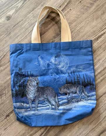This generous sized tote bag features a snowy wolf scene with a full moon and howling wolf silhouette in the background. Bag measures approximately 17" x 17".