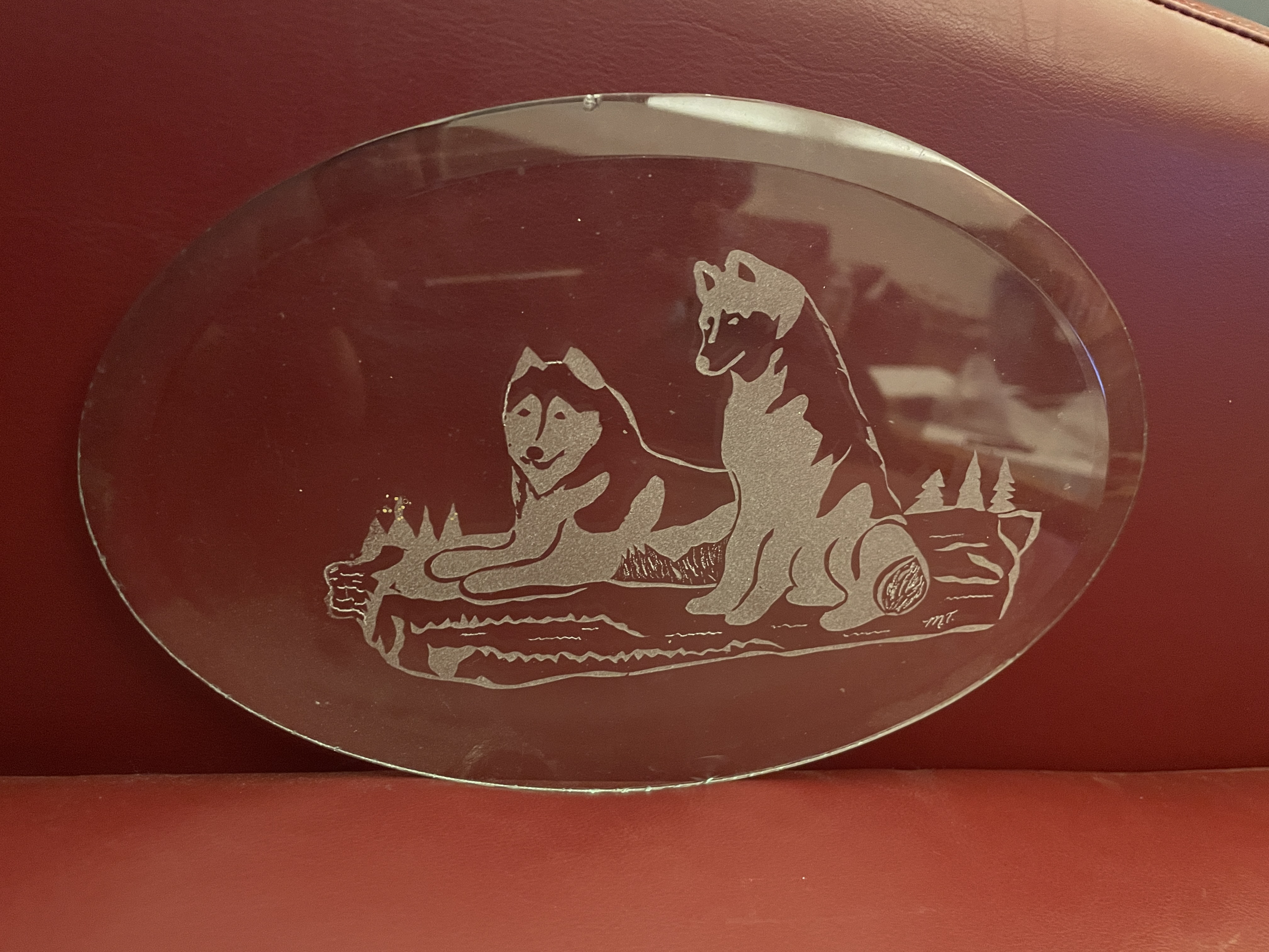 A beveled, oval piece of glass with 2 Siberian Huskies etched on it. Only a little worse for wear. It is 9" x 6".