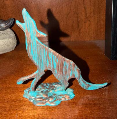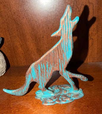 There is a faux patina on this cute little metal howling coyote. It measures 4" high x 4" at the widest point.