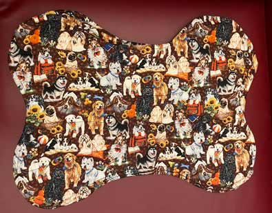 4 bone-shape quilted placemats. A mix of dogs (including a husky) on one side and some dog bones on the back. Made by Marie Stevens. The mats are 14" x 17".