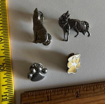 As pictured, there are 4 pins. A grey paw, a white and gold paw, and sitting howling husky and a standing one. The ruler is there to show their sizes. The howling huskies are about 1" long and the paws are about 2" square.