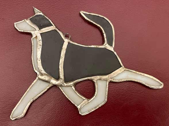This is a simple but nice black/white stained glass Siberian Husky from the estate of Marilyn Lassagne. Randee assumes that she may have made it. It is 5" x 4".