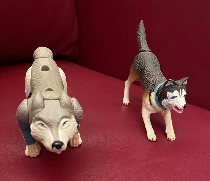 This lot includes an Inuit man who turns into a wolf and 2 huskies. All appear to have moveable parts. The man/wolf is 2" x 5" and the two huskies are 2" x 4".